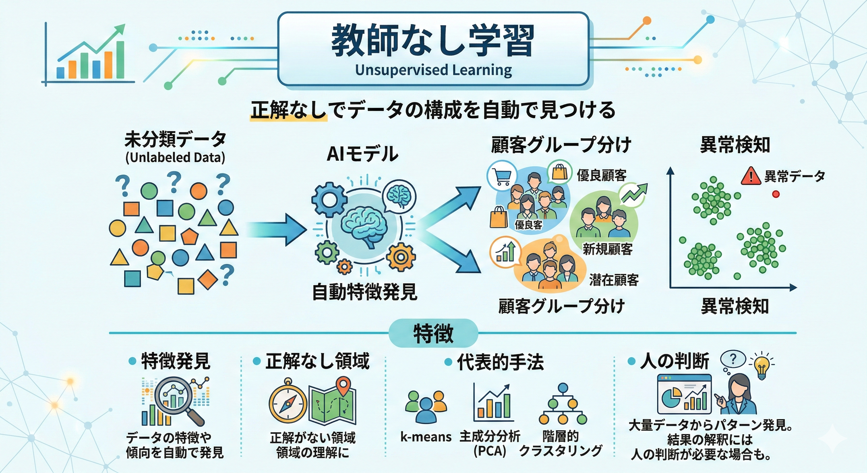 ・代表的な手法として、k-means、階層的クラスタリング、主成分分析(PCA)などがあります。