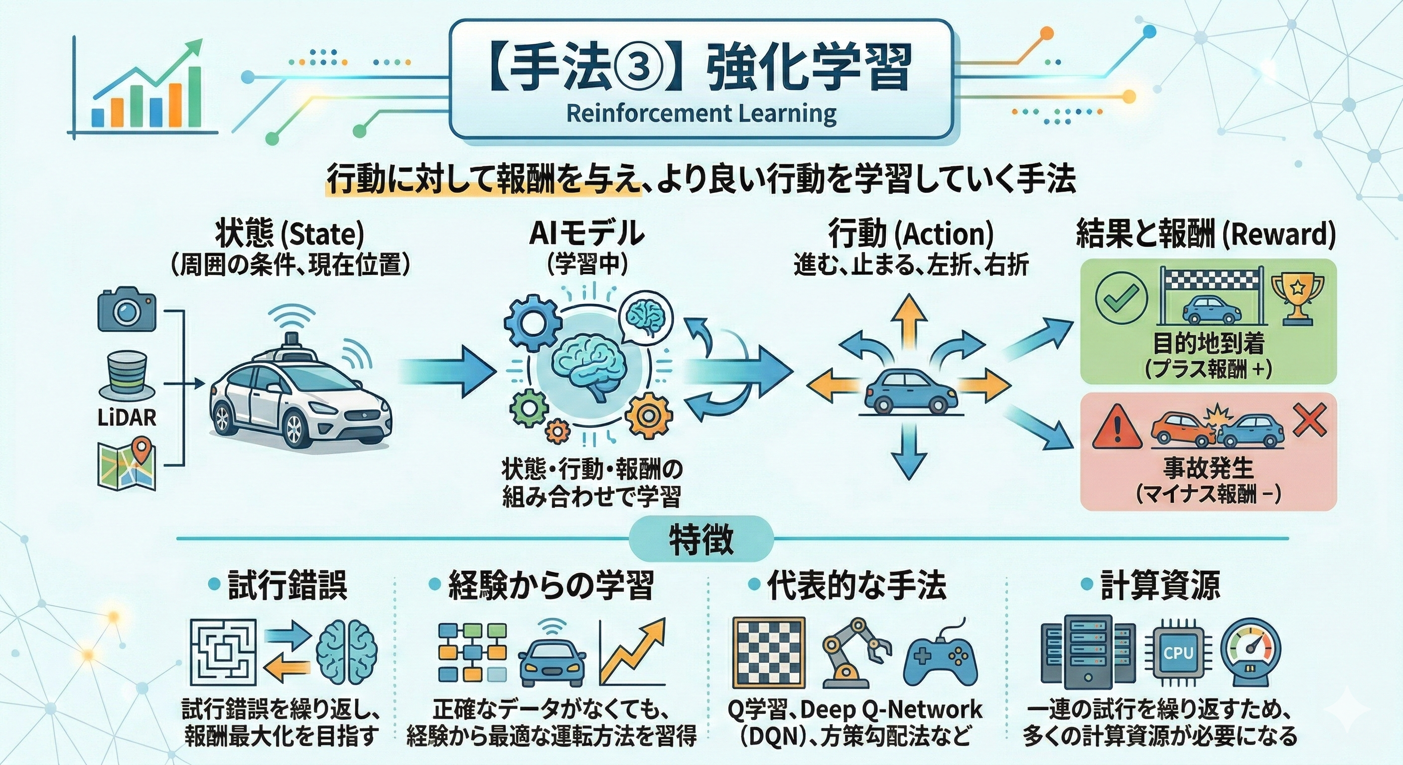 ・「状態」「行動」「報酬」の組み合わせで学習が進むのが特徴。