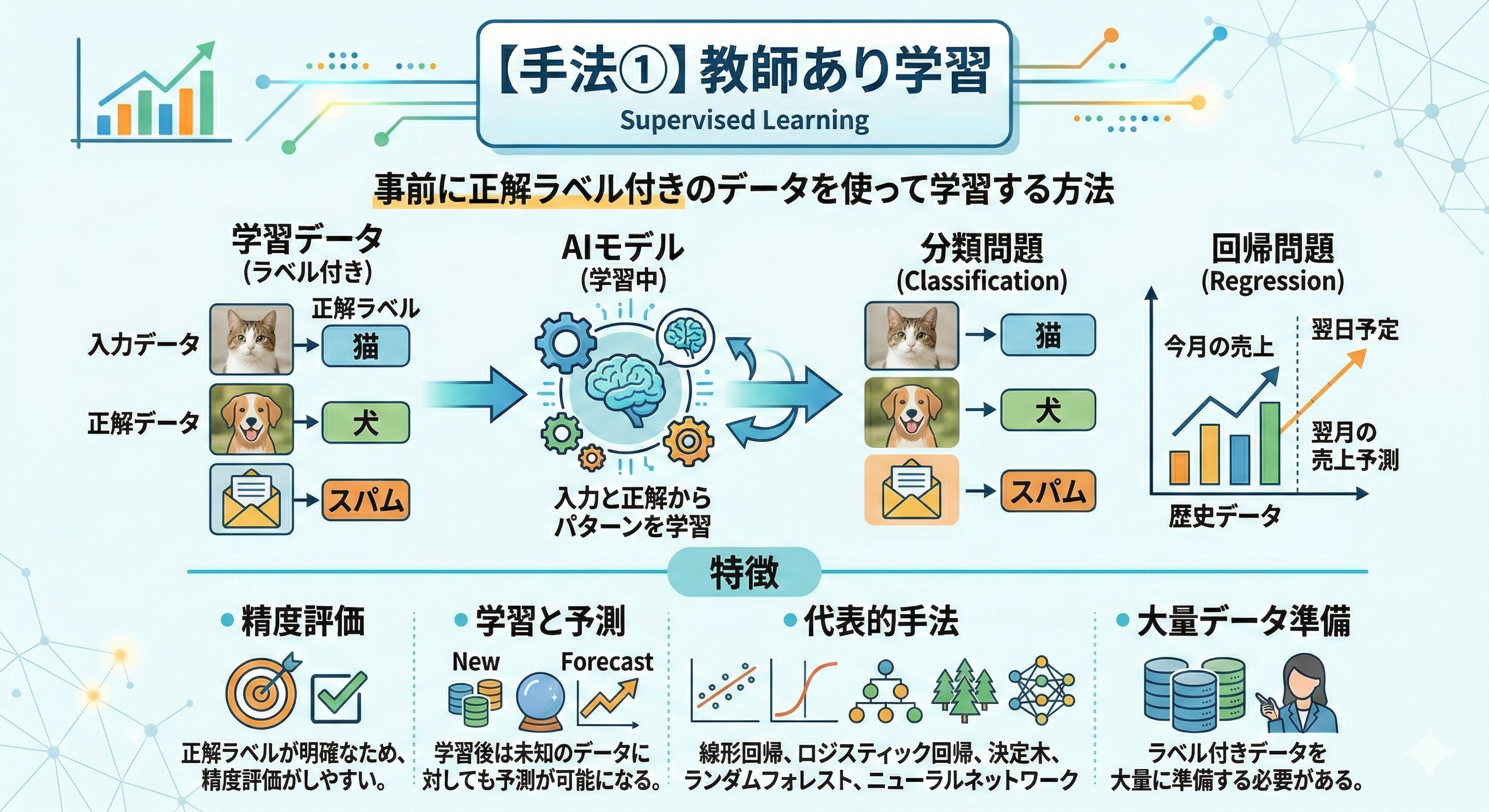 ・教師あり学習とは、事前に正解ラベル付きのデータを使って学習する方法です。