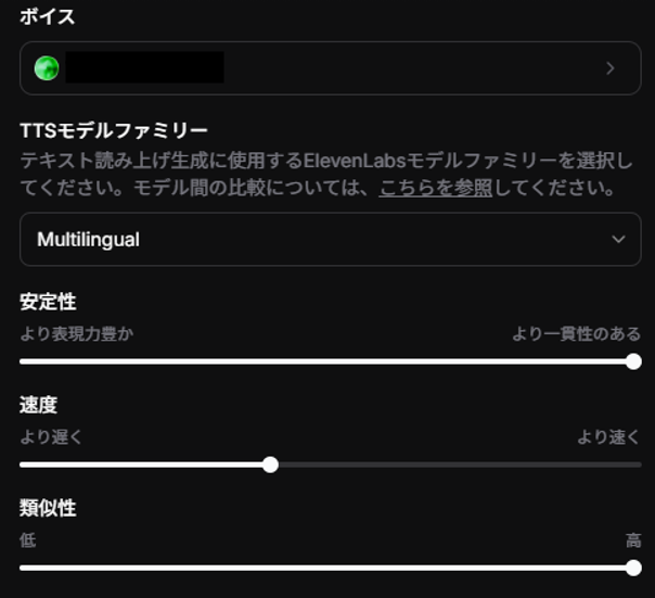 AIエージェントに設定したい音声とボイスモデル、読み上げ方について設定します。