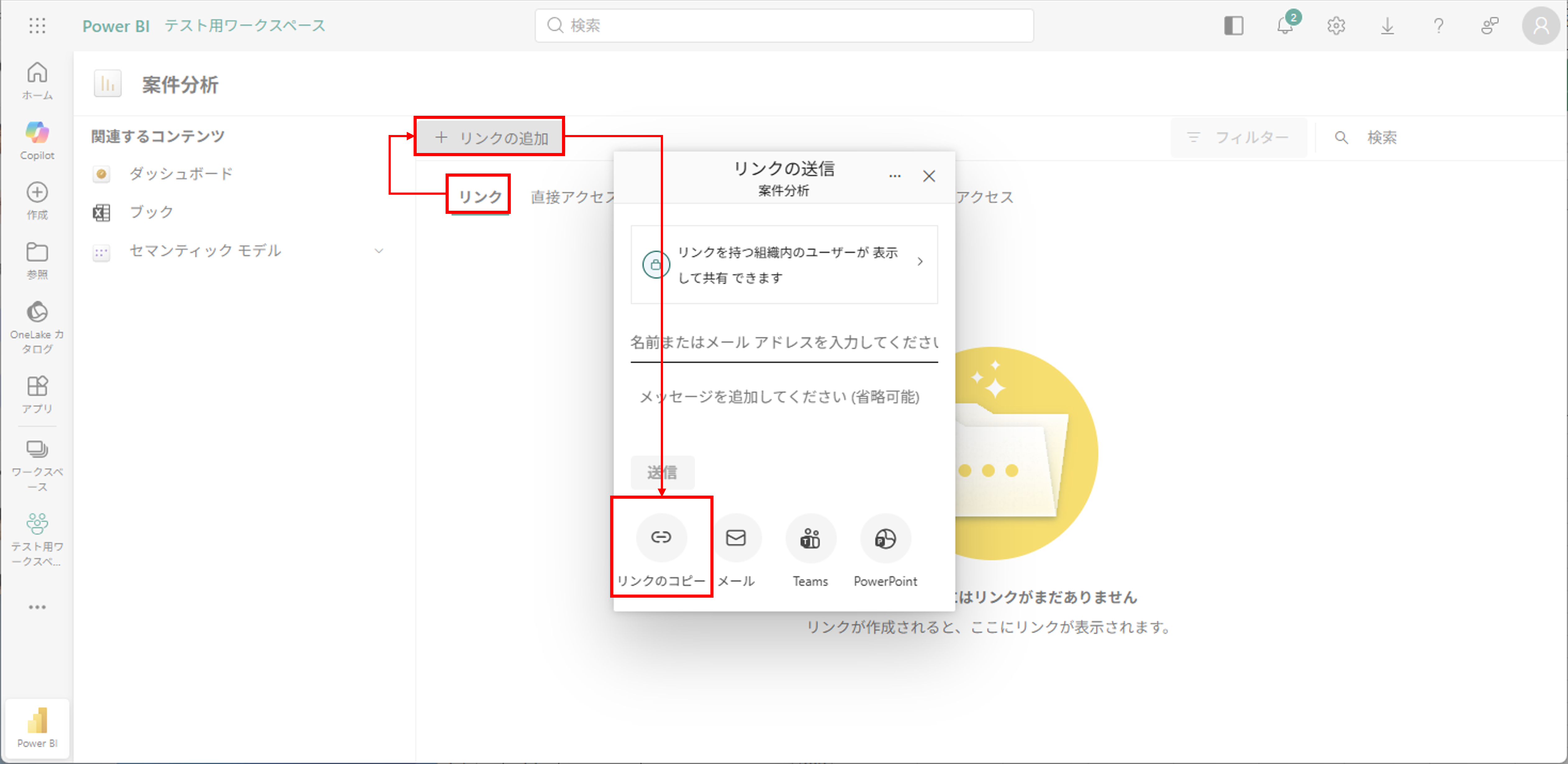 4.任意の共有範囲を指定し、[リンクのコピー]を押下する