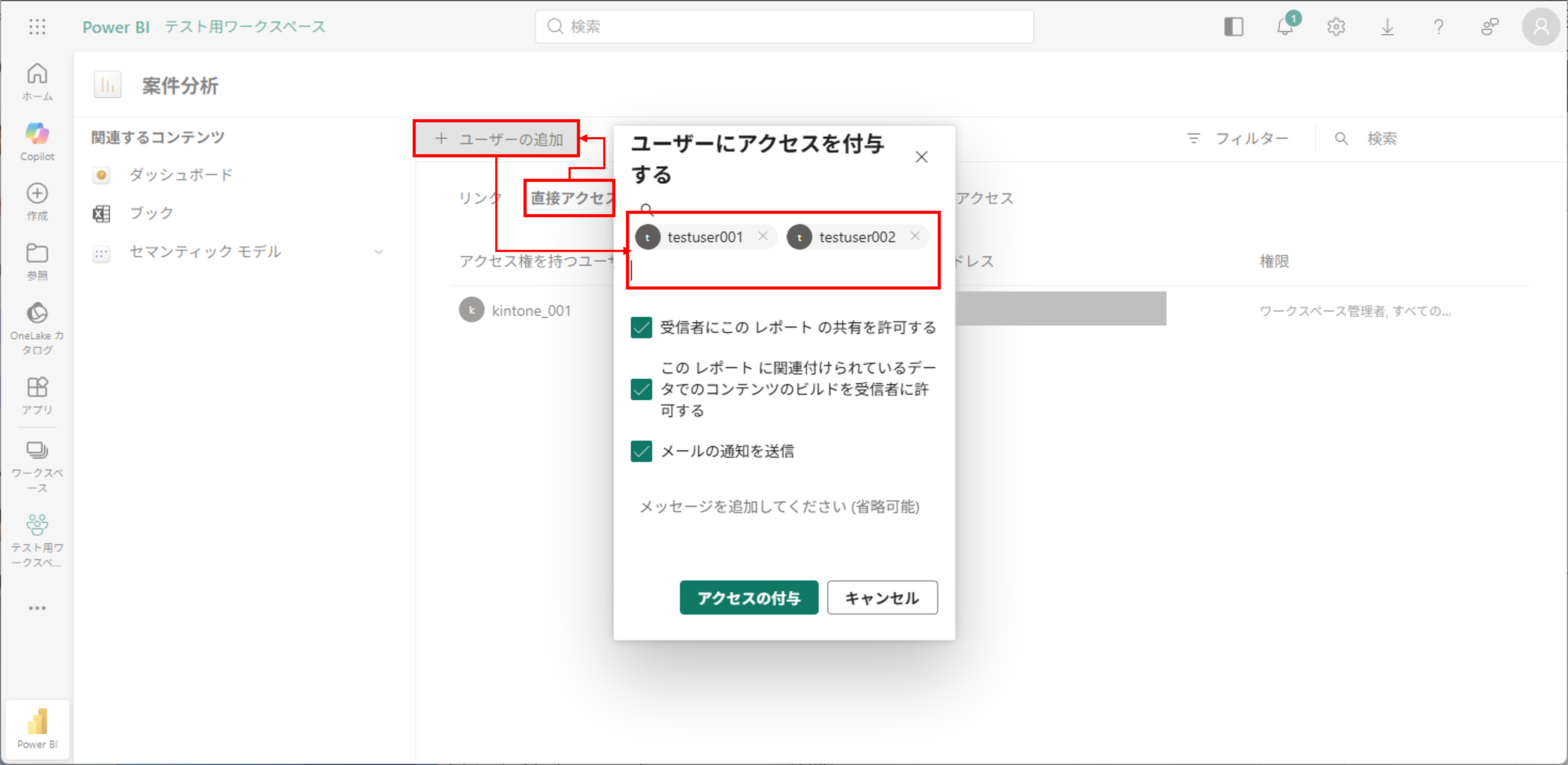 4.任意のユーザーを追加して[アクセスの付与]を押下する
