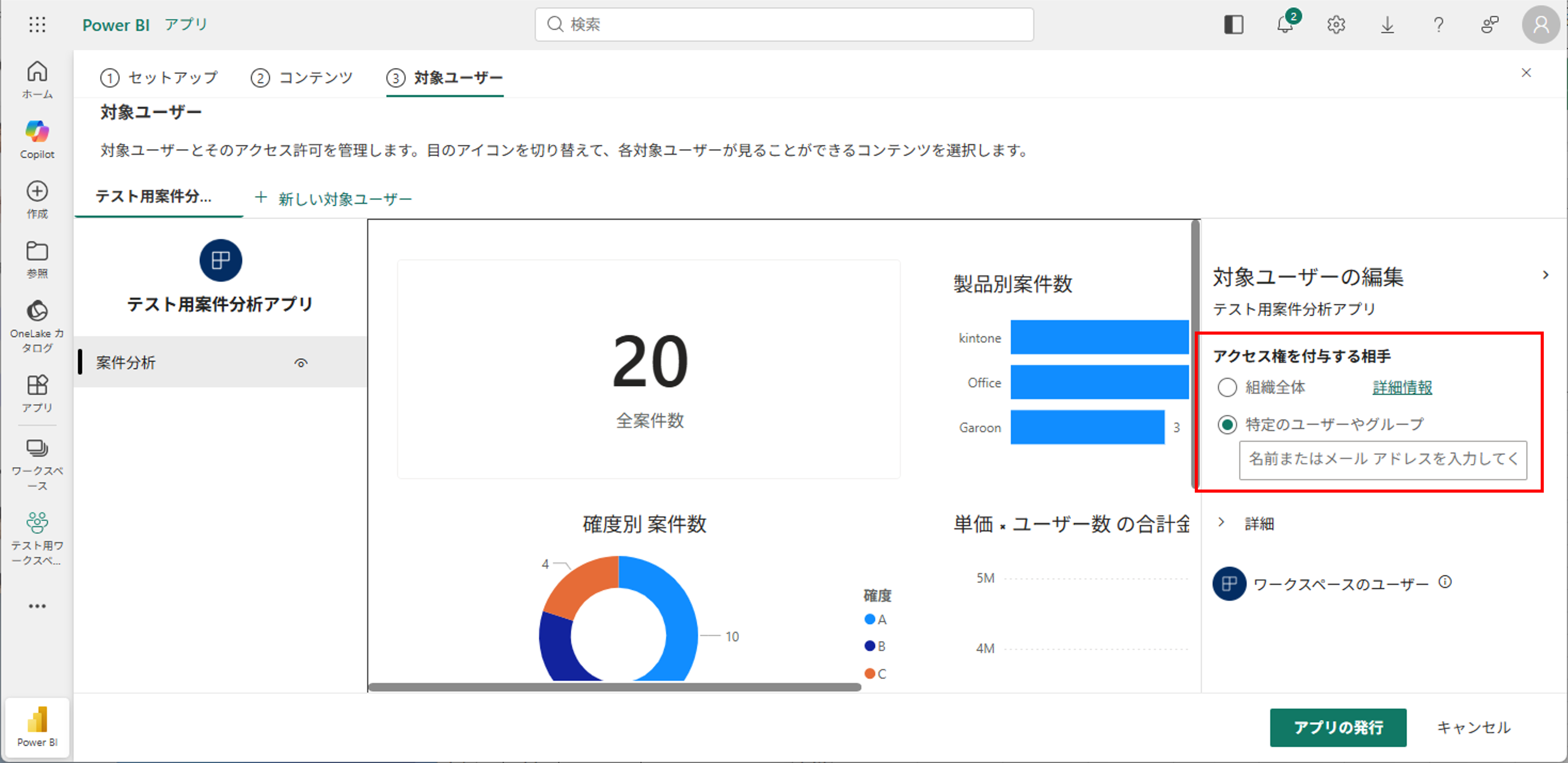 5.対象ユーザーの設定で[組織全体]もしくは[特定のユーザーやグループ]を選択し、[アプリの発行]を押下する