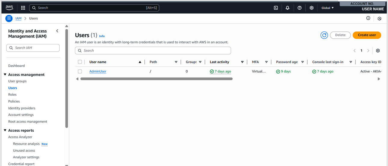 - From the Management Console dashboard, search “IAM” in the search bar, and click on the relevant result. You will be presented withe the following screen.