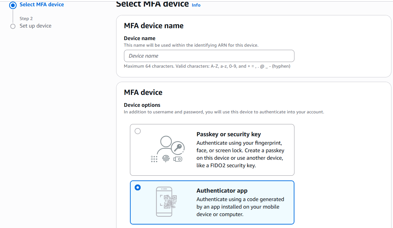 - Since for this setup, we intend to set our mobile phone as our authentication device, you must ensure that you have an authentication app installed. Then, in the screen above, you may set the name of your MFA device, then select the “Authenticator app” option. Then, click “Next”.