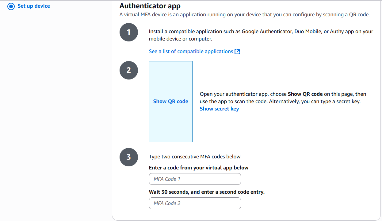- The above screen will be displayed to you. As you can see, AWS already recommends a few authentication apps by default. Once you have the app setup on your mobile device, use it to scan the QR code that will be displayed in the above screen(if it supports QR code.) Otherwise, you will need to manually input a long secret key to register the app.